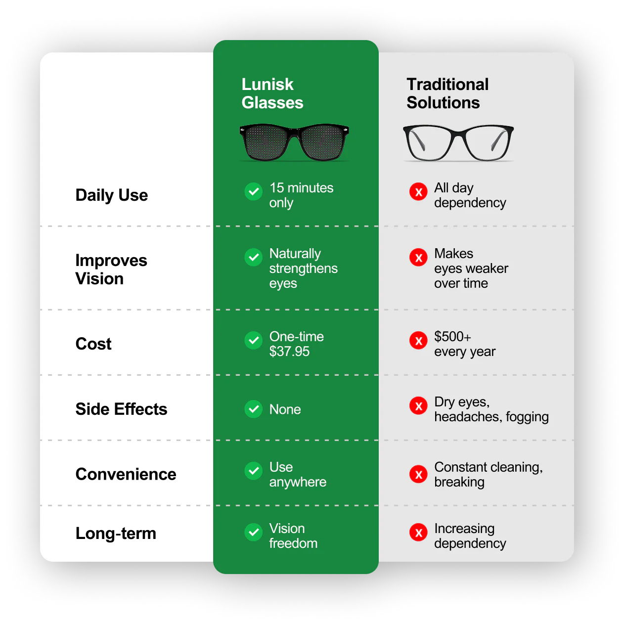 We offer Lunisk Correction Glasses at a fraction of the cost of LASIK or traditional lenses. While LASIK can cost around $2,000 and annual glasses or contacts over $150, Lunisk provides clearer vision for only $37.95—a lasting investment in visual freedom.